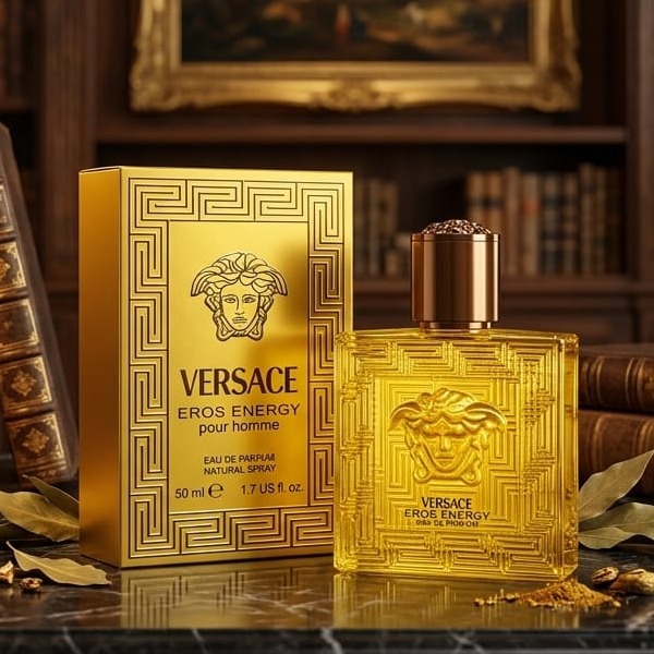 Versace Eros Energy Eau de Perfume Featuring a Vibrant Yellow Bottle With a Brown CapVersace Eros Energy Eau de Perfume Featuring a Vibrant Yellow Bottle With a Brown Cap